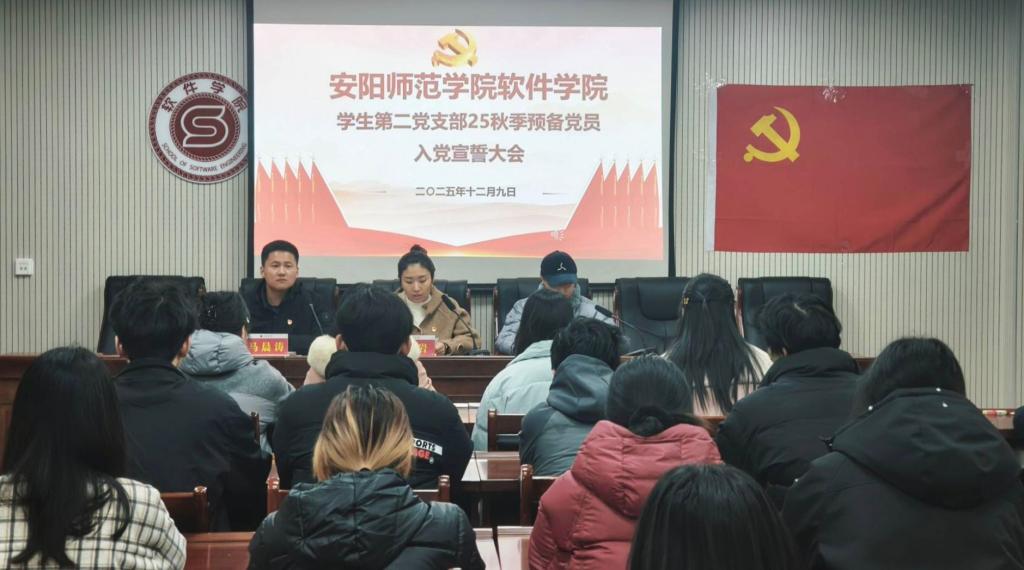 12月9日上午,软件学院学生第二党支部于教学楼202会议室召开2025秋季预备党员入党宣誓大会。软件学院学生第二党支部书记郭岩,学生第二党支部组织委员马晨涛,学生第二党支部宣传委员张雪华出席活动,学生第二党支部全体预备党员及入党积极分子参加本次活动。