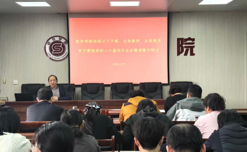 为深入学习贯彻党的二十届四中全会精神,准确把握“十五五”时期发展蓝图与战略部署,2026年3月27日,软件学院开展科级以下干部、党员学习贯彻党的二十届四中全会精神集中研讨。学院科级以下干部、全体教师及全体党员参加。