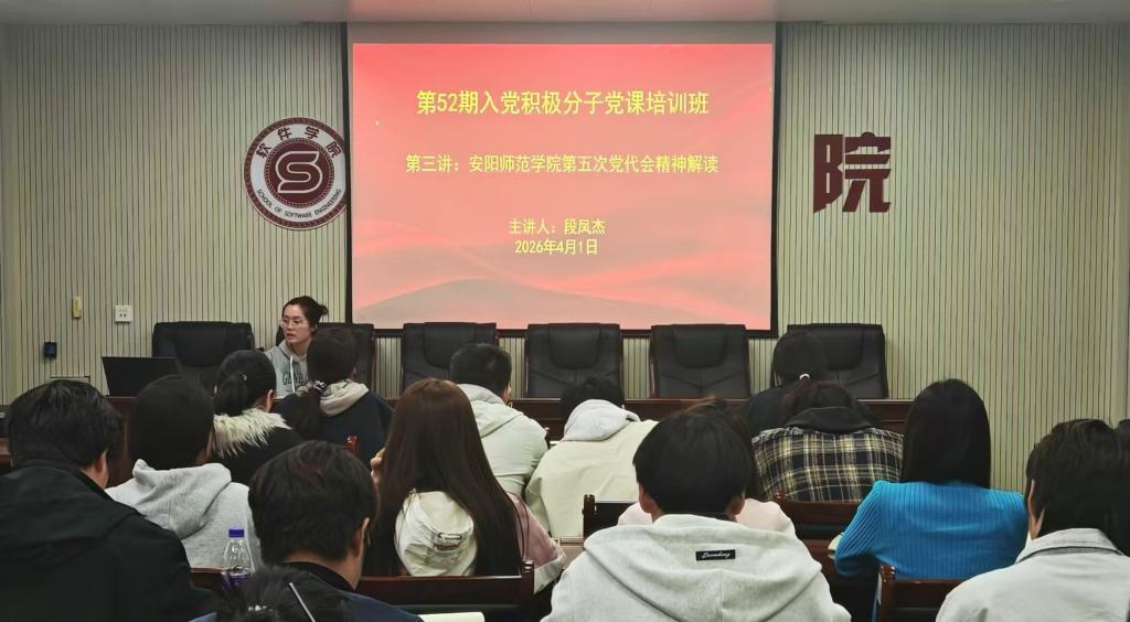 4月1日中午,软件学院学生第一党支部宣传委员段凤杰同志在教学楼202会议室为第52期入党积极分子讲授以“安阳师范学院第五次党代会精神解读”为主题的专题党课。