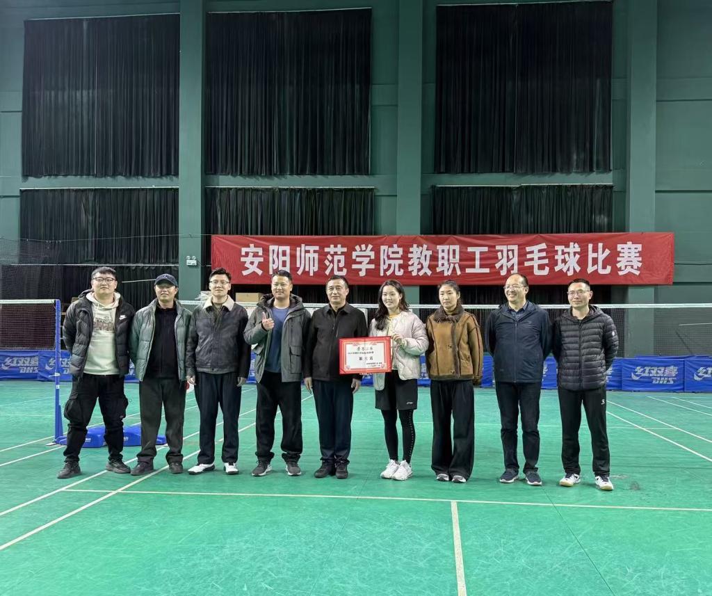 为丰富教职工文化体育生活,增强团队凝聚力,安阳师范学院于11月24日至28日在校和健A馆成功举办教职工羽毛球比赛。全校22支队伍展开激烈角逐,我院教职工代表队团结协作、奋勇拼搏,最终荣获团体赛第三名,我院参赛教师平静在男子单打项目中取得全校第五名的优异成绩。